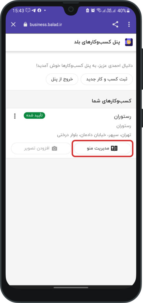 بر روی گزینه “مدیریت منو” در قسمت کسبوکارهای شما کلیک کنید.