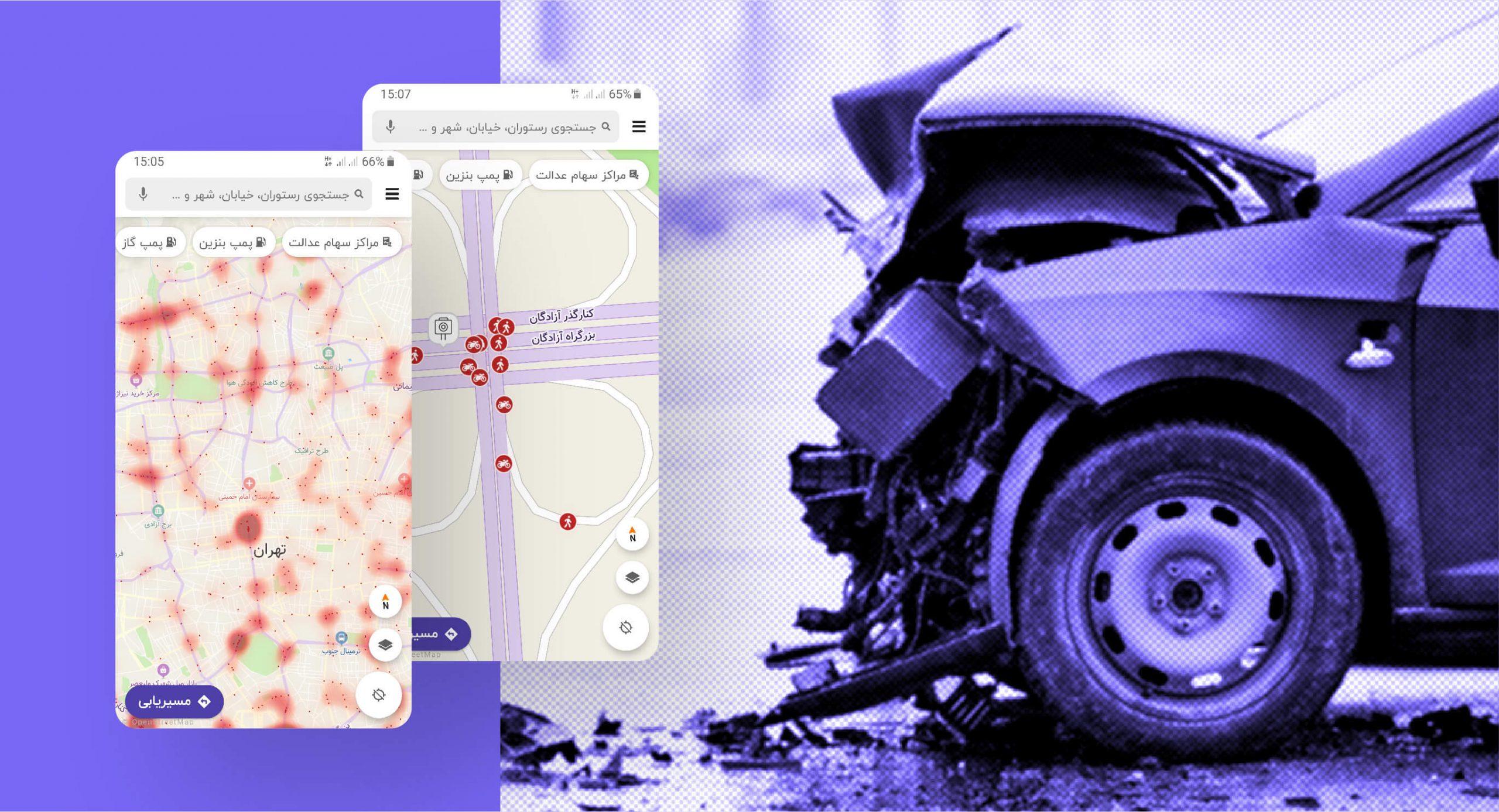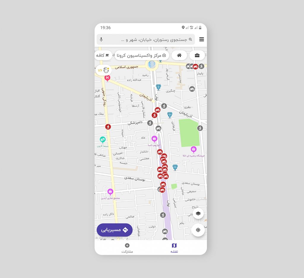 - بعد از روشن شدن این لایه، نقشه تهران را با پراکندگی نامتقارنی از نقاط و محدودهایی با رنگ قرمز میبینید. اگر بخواهید نقاط پرتصادف اطراف خودتان را بهتر ببینید هم میتوانید بزرگنمایی نقشه را بیشتر کنید تا جزئیات بیشتری از این اطلاعات را مشاهده کنید. بر روی هر نقطه تصادف از سه علامت خودرو، عابر پیاده و موتور استفاده شده که نمایشدهنده فرد متوفی در تصادف مربوط به آن نقطه است.