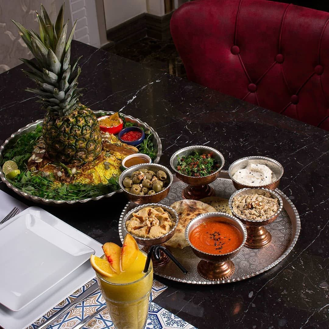 در بخش غذای اصلی میتوانید از انواع سوخاری، کبابهای ایرانی یا عربی، پاستا، برگر، شاورما و… سفارش دهید ولی پیشنهاد ما انتخاب غذاهای خاصتر این رستوران مجلل است. خوبز مامونیا حرف ندارد. میتوانید خوبز الحم، خدرا، مامونیا یا الدجاج را با توجه به سلیقه خود انتخاب کنید و از آن لذت ببرید. البته حتما برای یکبار هم که شده مندی پلو، حساءالبازنجان، مجبوس باللحم و مقلوبه باللحم را که برنجهای طعمدار شده با انواع ادویه و گوشت گوسفند یا گوساله است امتحان کنید که طعمی کمنظیر و خاص دارند.