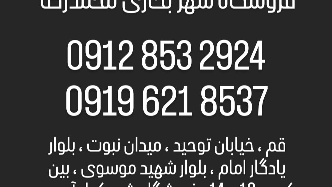قم ، خیابان توحید ، میدان نبوت ، بلوار یادگار امام ، بلوار شهید موسوی ، بین کوچه ۱۲ و ۱۴ ، پلاک ۱۶۲