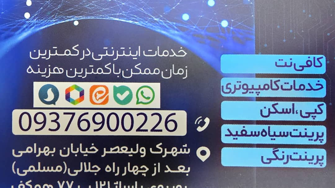 تهران،ولیعصر جنوبی،خ برادران بهرامی بین به خیال و مسلمی،پ 77 طبقه همکف