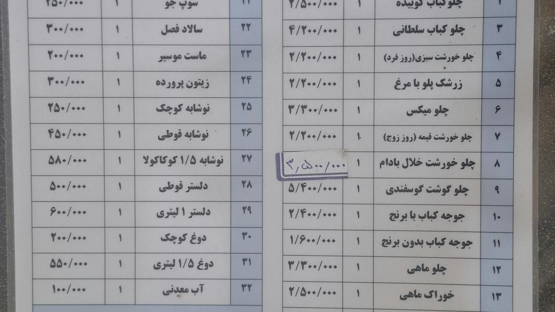 قیمتها مناسب سالن رستوران تمیز و بزرگ بود ما تابستون رفتیم کاملا خنک بود رفتار پرسنل خوب خورشت خلال و کباب برگ مخصوص خوردیم از یک تا ۵نمره ۳میدم لیست قیمت هم گذاشتم شهریور ۱۴۰۴